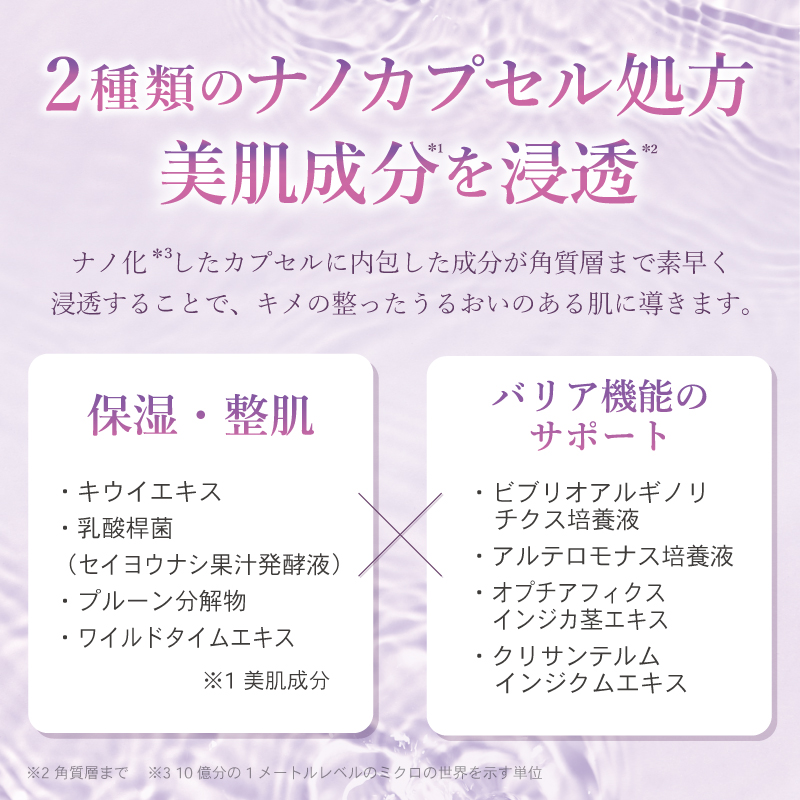 | 水、BG、プロパンジオール、スクワラン、マカデミアナッツ脂肪酸エチル、ペンチレングリコール、トレハロース、マカデミアナッツ脂肪酸フィトステリル、1,2−ヘキサンジオール、ラウロイルグルタミン酸ジ(フィトステリル/オクチルドデシル)、グリセリン、水添レシチン、カルボマー、水酸化K、(アクリレーツ/アクリル酸アルキル(C10−30))クロスポリマー、ラベンダー油、トコフェロール、キウイエキス、リン酸アスコルビルMg、グリチルリチン酸2K、α−グルカンオリゴサッカリド、ヒアルロン酸Na、マルトデキストリン、乳酸桿菌/セイヨウナシ果汁発酵液、酢酸ファルネシル、ファルネソール、トリ酢酸パンテニル、ラウロイルラクチレートNa、プルーン分解物、セイヨウヤブイチゴ葉エキス、ビブリオアルギノリチクス培養液、アルテロモナス培養液、オプンチアフィクスインジカ茎エキス、クリサンテルムインジクムエキス、メリアアザジラクタ葉エキス、セラミドNP、セラミドAP、フィトスフィンゴシン、ワイルドタイムエキス、コレステロール、キサンタンガム、セラミドEOP |