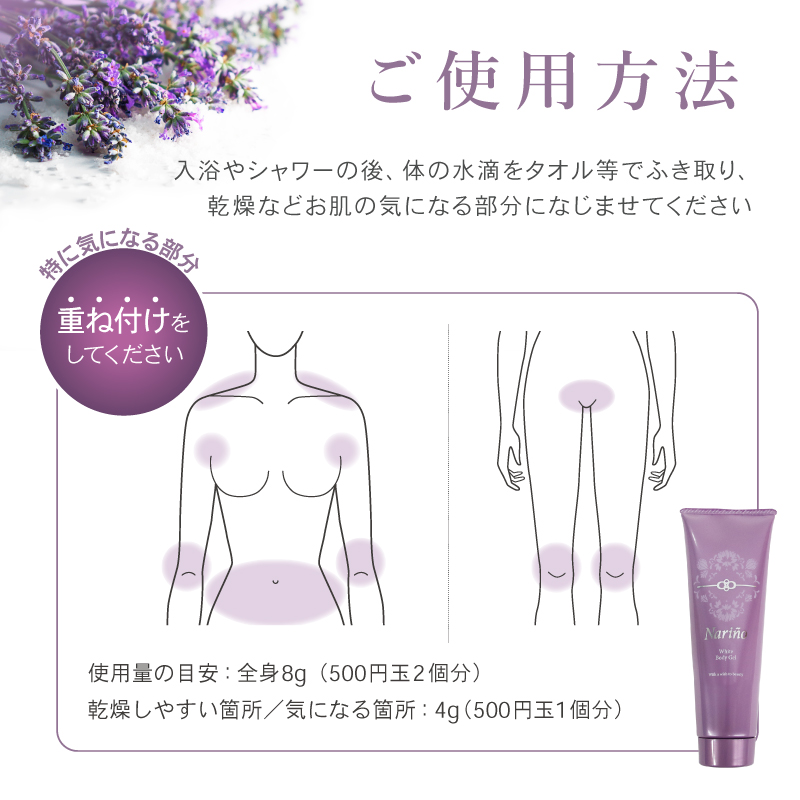 | ・入浴やシャワーの後、からだの水滴をタオル等で拭き取リ、乾燥などお肌の気になる部分になじませてください。 ・気になる部分には、重ね付けをしてください。 ![]() 【使用量の目安】 全身8g (500円玉2個分) 乾燥しやすい箇所/気になる箇所 4g(500円玉1個分) |