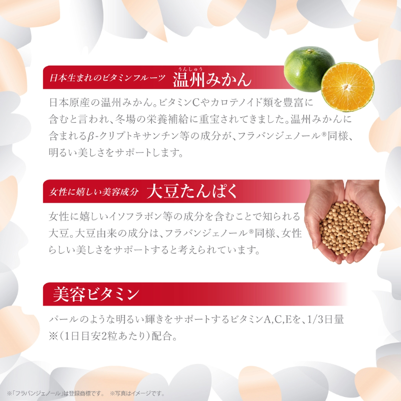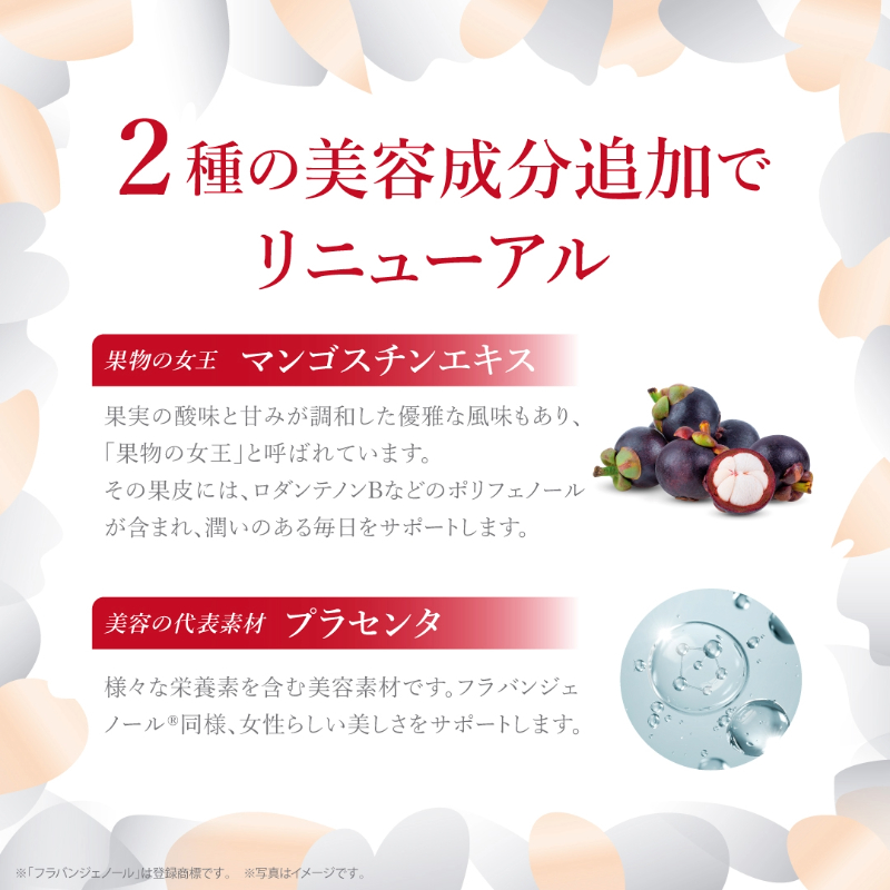 | 麦芽糖(国内製造)、松樹皮エキス末、大豆たんぱく末、シルク加水分解物、温州みかん末、黒胡椒エキス末、マンゴスチン果皮エキス末、豚プラセンタエキス末/セルロース、V.C、ステアリン酸Ca、二酸化ケイ素、V.E、V.A、 |