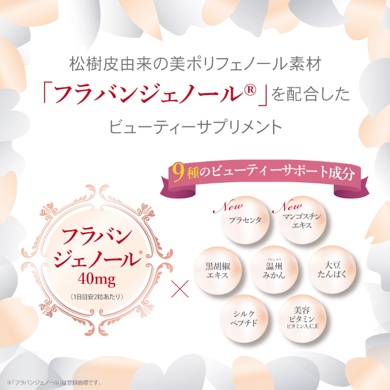 | 麦芽糖(国内製造)、松樹皮エキス末、大豆たんぱく末、シルク加水分解物、温州みかん末、黒胡椒エキス末、マンゴスチン果皮エキス末、豚プラセンタエキス末/セルロース、V.C、ステアリン酸Ca、二酸化ケイ素、V.E、V.A、 |